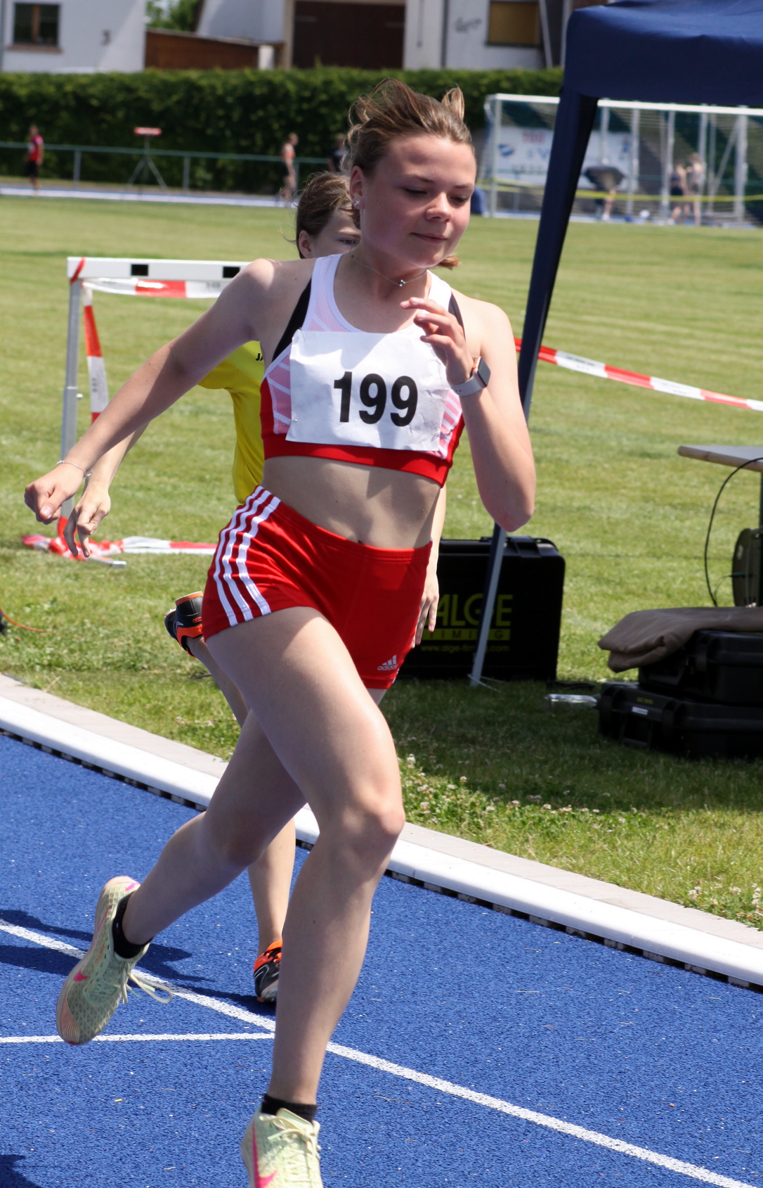 Noch deutlicher fiel der Erfolg von Jolina Marie Schmidt in der weiblichen Jugend W14 aus. Hier waren aufgrund des großen Teilnehmerfeldes Vor-, Zwischen- und Endlauf zu absolvieren. Schmidt gewann Vor- und Zwischenlauf souverän und glänzte dann im Finale in 13,57 Sekunden als einzige Athletin im Feld mit einer Zeit unter 14 Sekunden. Hätte der Wind nicht mit mehr als zwei Meter/Sekunde von vorn geblasen, wäre wohl eine neue Bestzeit fällig gewesen.